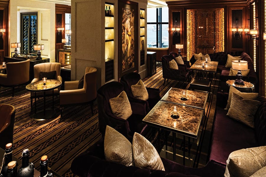 The intimate bar at the Four Seasons features a luxury setting with harbor views, an extensive wine list, and tasty bites.